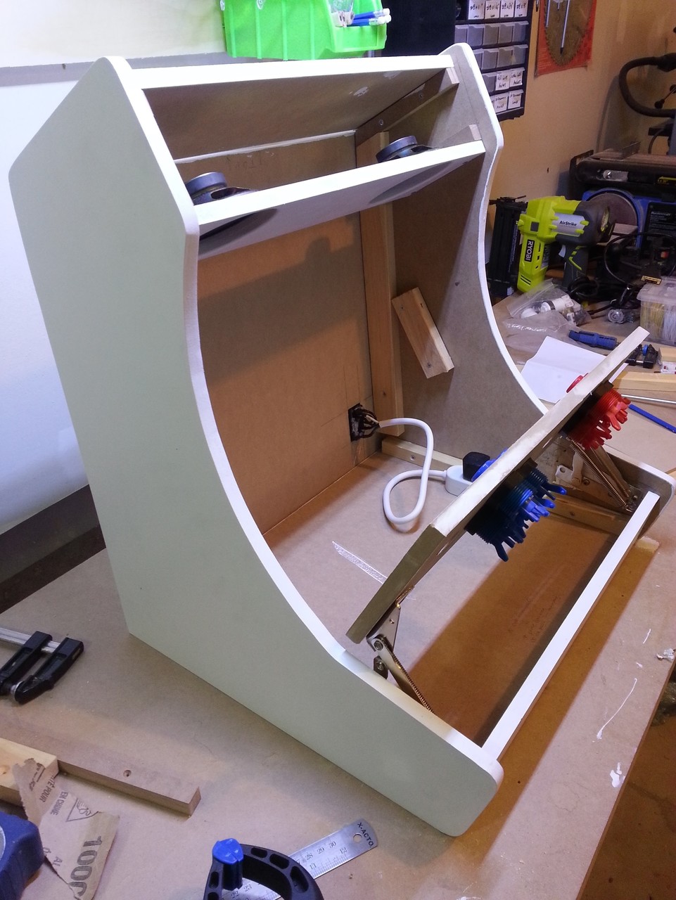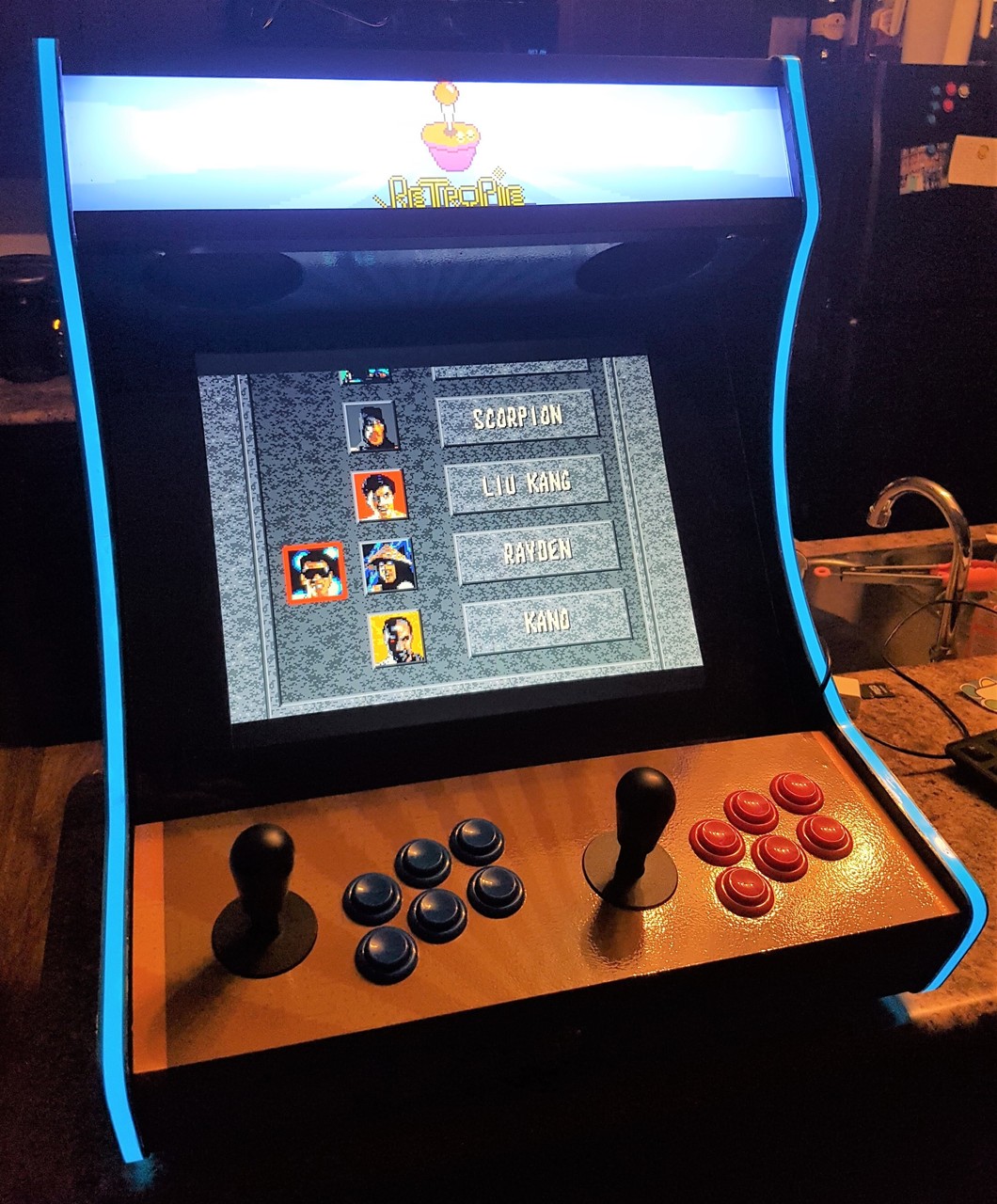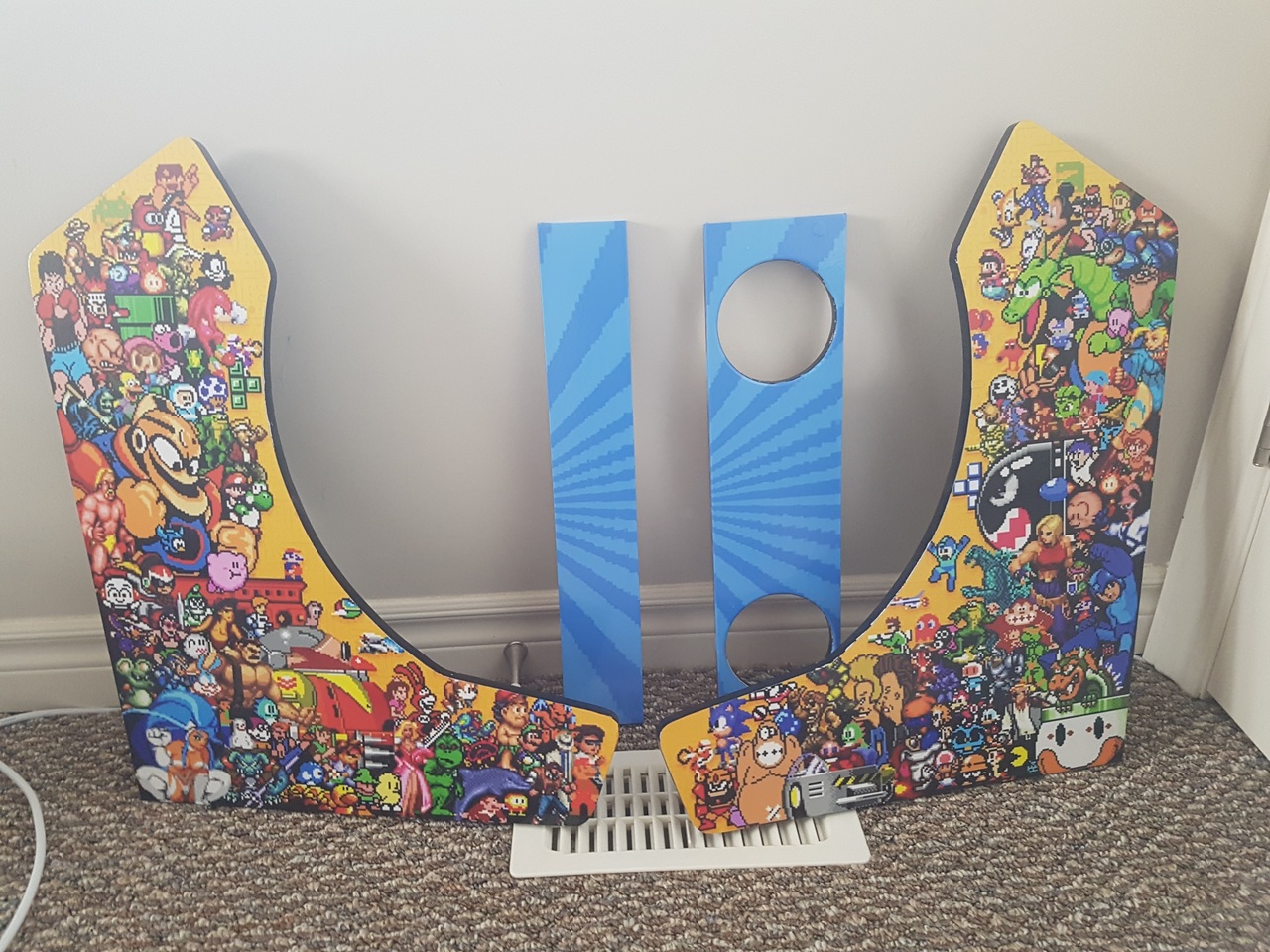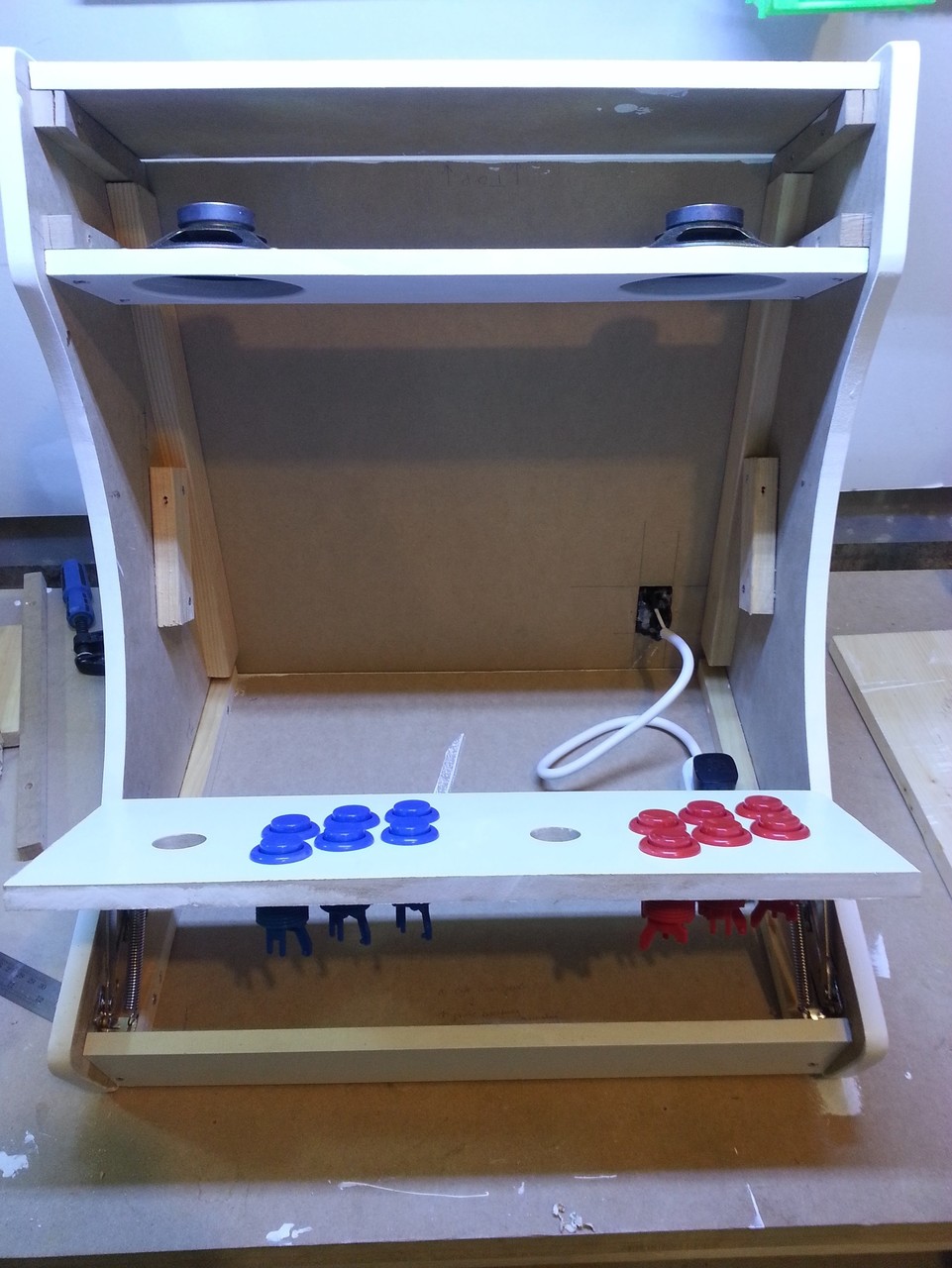 I first dreamed of building an arcade cabinet from a young age, spending many hours researching on the BYOAC forums. My first order for joysticks and buttons was submitted in early 2006. After many years of no progress, in late 2017 all the pieces came together thanks to the WeeCade plans (and a friend who graciously printed my Vinyl for free). While some of the parts were sold over the years, the buttons in this arcade are still from the original 2006 order. The plans were followed fairly accurately with a few small modifications: some dimensions were modified to fit the screen; the T-moulding was replaced with glowing EL tape; and the control panel was placed on lifting hinges, held down by lock and key.