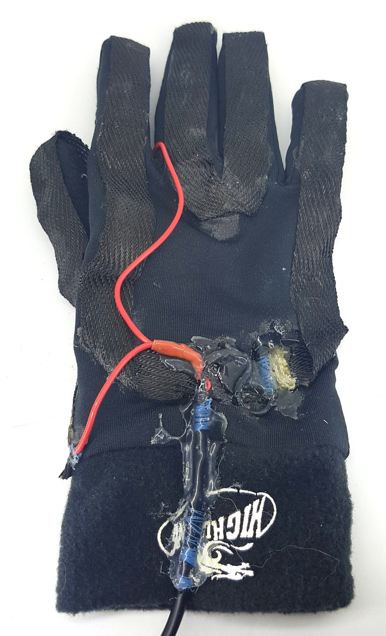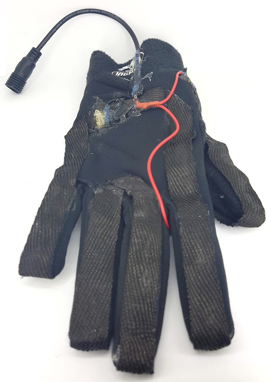 The heating fabric was simply glued down to the gloves using some waterproof Goop adhesive since everything else peeled off with little effort. This was the only adhesive that remained flexible and allowed the fabrics to stretch with a closed fist.