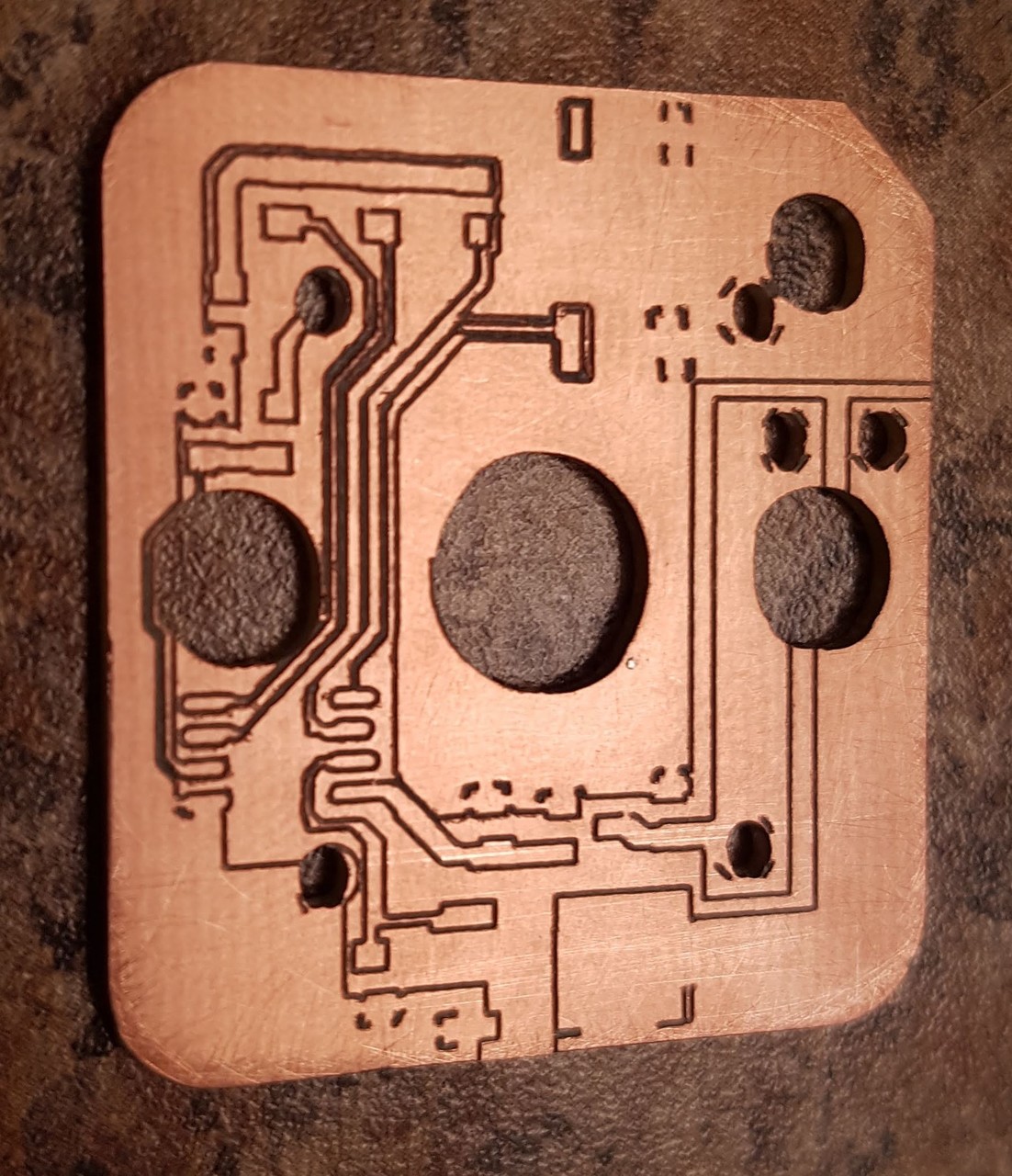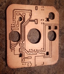 The custom PCB uses a PIC12F1572 with the same pushbutton and LED configuration, but allows the button to be held to set the output power in three levels: (off), low, medium, or high. There is no schematic because of the ridiculous simplicity of the overall circuit, which was thrown together super quickly as a test for my cheap PCB milling machine.